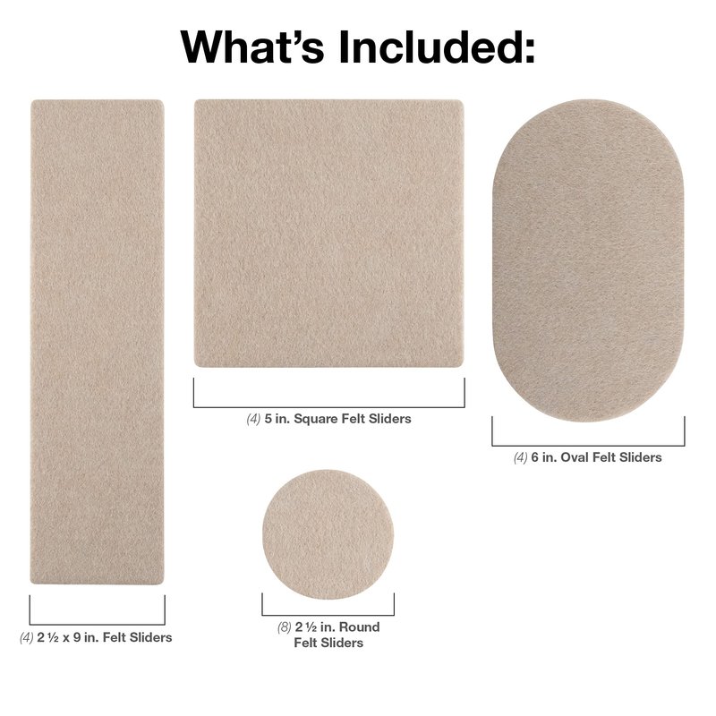 - Pack Includes: (8) 3 1/2 round, (4) 5" square, (4) 3 1/2 x 6" oval, (4) 2 1/2" x 9" rectangle felt furniture sliders, Beige