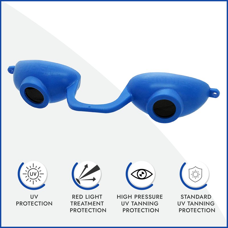 - UV PROTECTION: Evo tanning bed goggles block over 99.9% of the UV-B rays and over 99% of UVA rays while allowing vision and meets all FDA's 21 CFR 1040.20 UV ray protection. This UV tanning eye protection eyewear works as red light therapy goggles eye protection too.a