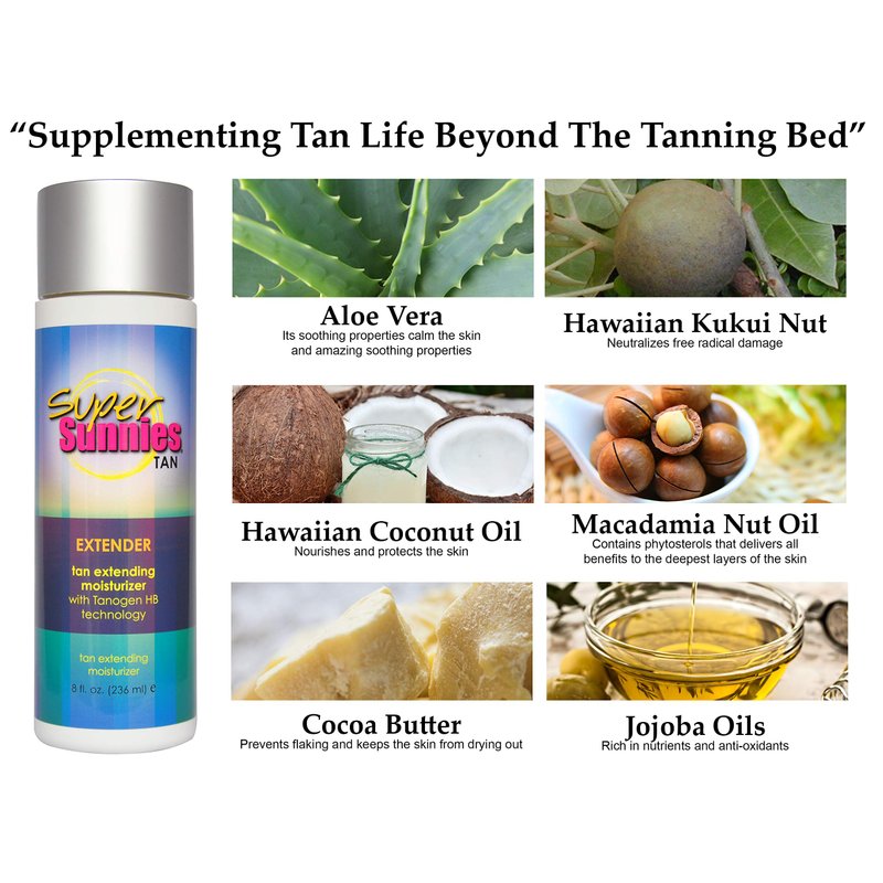 Super Sunnies Tan Extender Moisturizer Lotion with Tanogen HB for Indoor Tanning Beds & Sunless Tanning, Enriched with Aloe & Hawaiian Coconut Oil, Jojoba Oil & Nuts 8 oz.