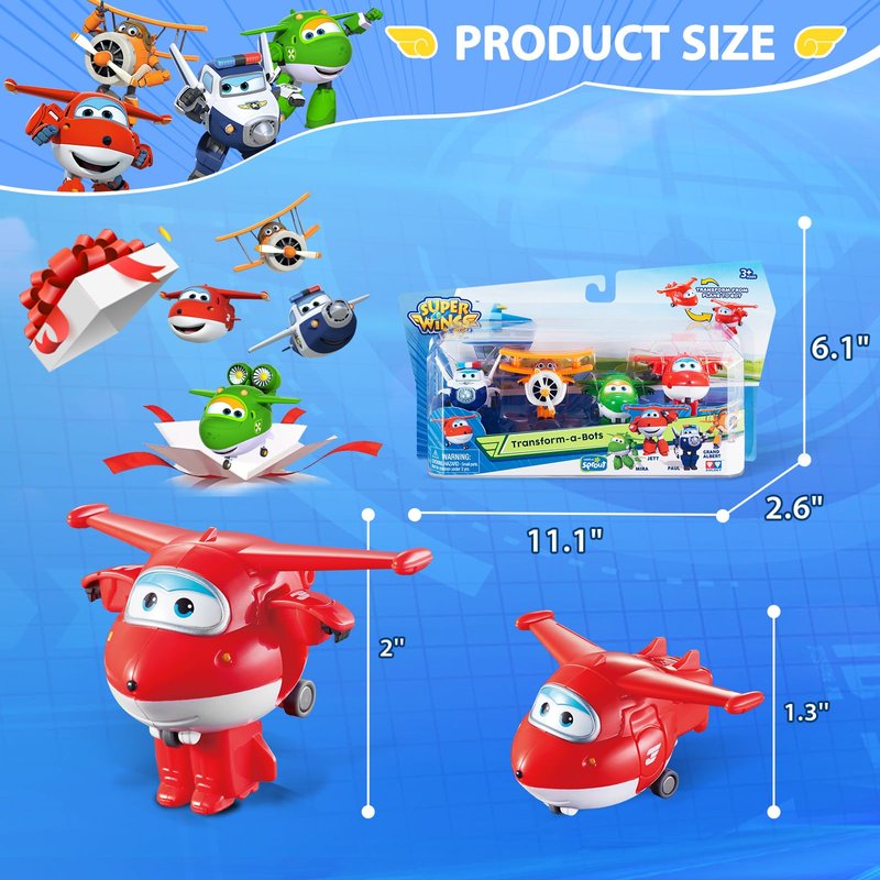 - Super Fun for Preschool Kids - Super Wings 2" transform-a-robots pack is made for preschool Super Wings fans who are over 3 years old. The 2” transforming action figure can transforms from airplane to robot in just 3 easy steps and no batteries are required for this super wings toy, so there is no worries about the power shortage that kids can have fun anytime and anywhere.