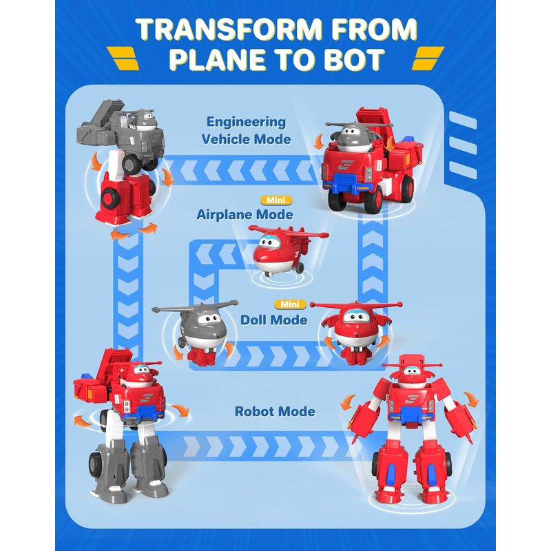 - 2 Play Methods and No battery required - Transform from a toy vehicle to a bot in 10 Easy Steps. Large vehicles and mini Jett can be separated and integrated. The Superwings Mini Jett can be easily assembled/disassembled in the cab of the Robo Rig. The Mini Jett Superwings have wheels and can slide. The Jett Robo Rig can be turned into a fire truck with extending ladder and real working Wheels. No batteries are required for this super wings toy, so there is no worries about the power shortage that kids can have fun anytime and anywhere.