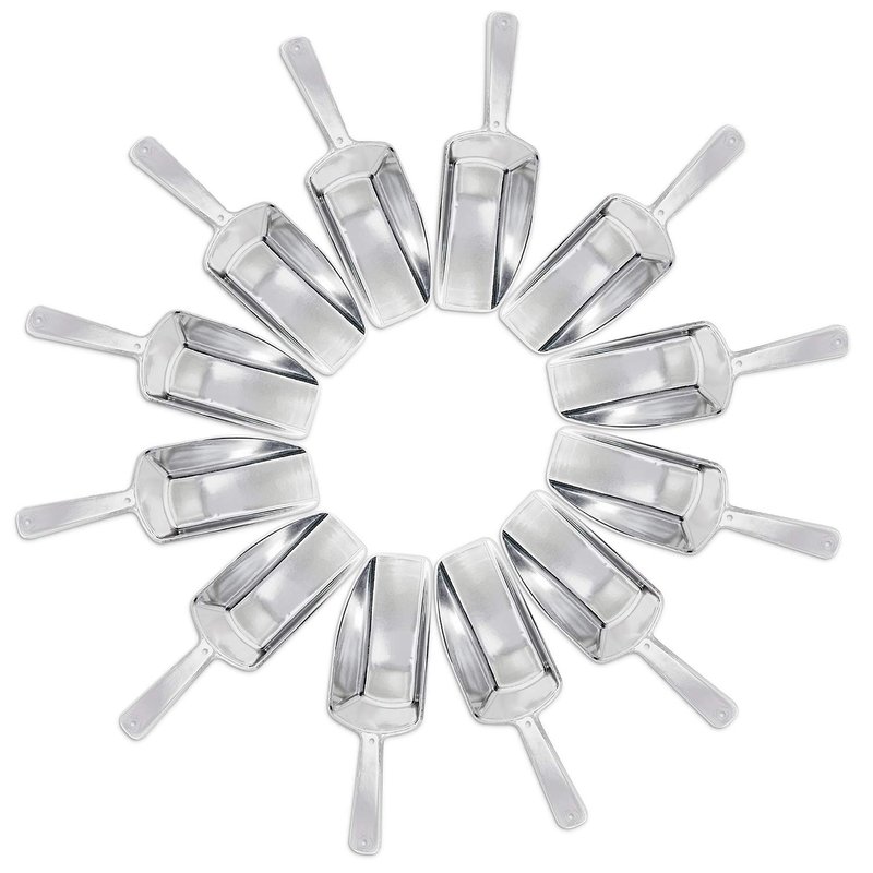 - Comes in a package of 12 mini silver acrylic scoops. Each scoop measures at 5.5" inches x 1.75" inches. Each scoop holds up to 2oz.