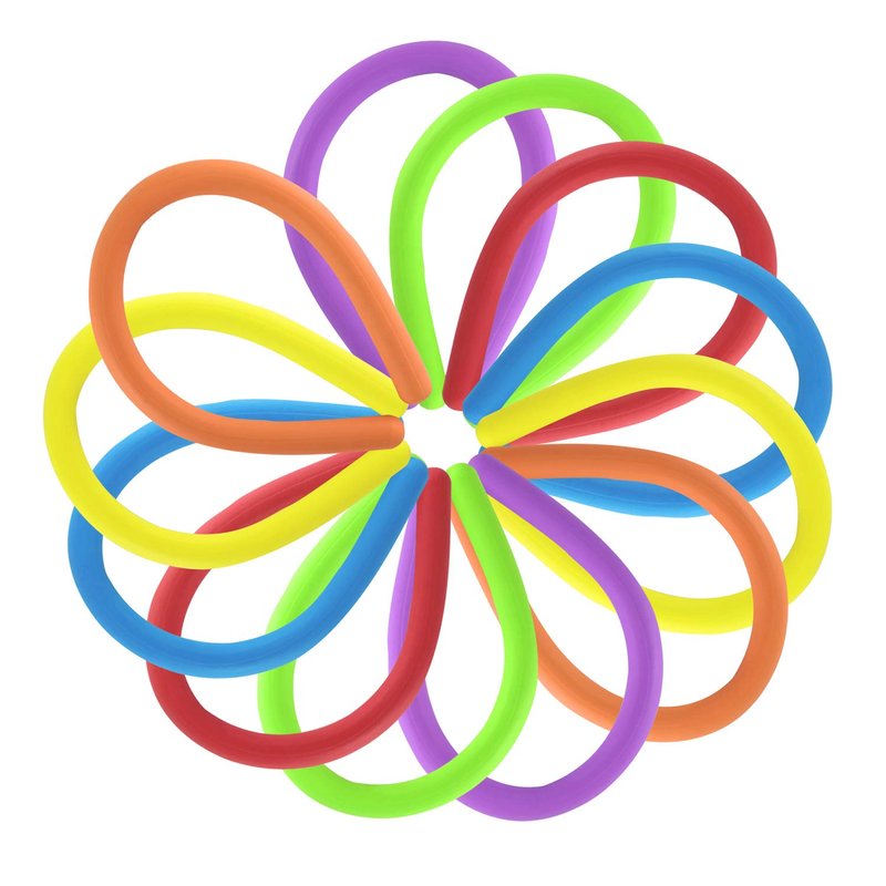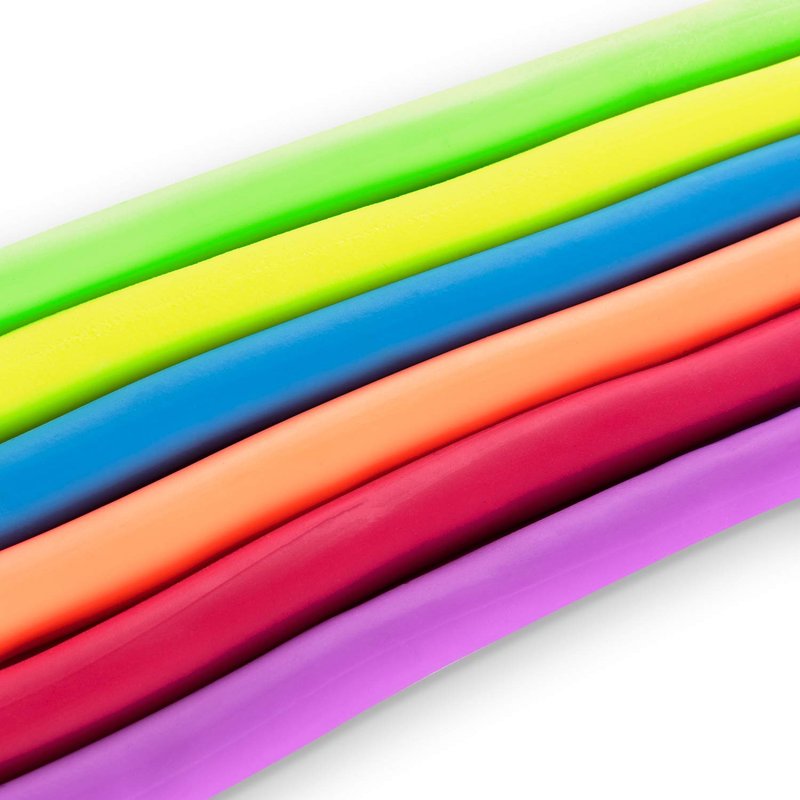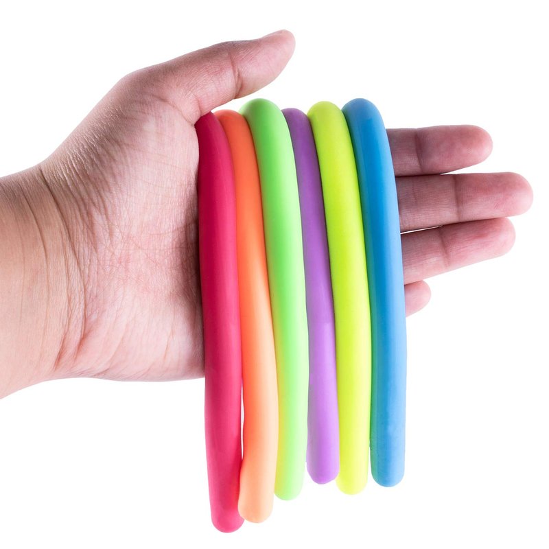 - Each thick jelly string noodle measures 10" inches and can stretch to over 5 feet long. Comes in a total of 12 rubber noodle toys, in assorted colors.
