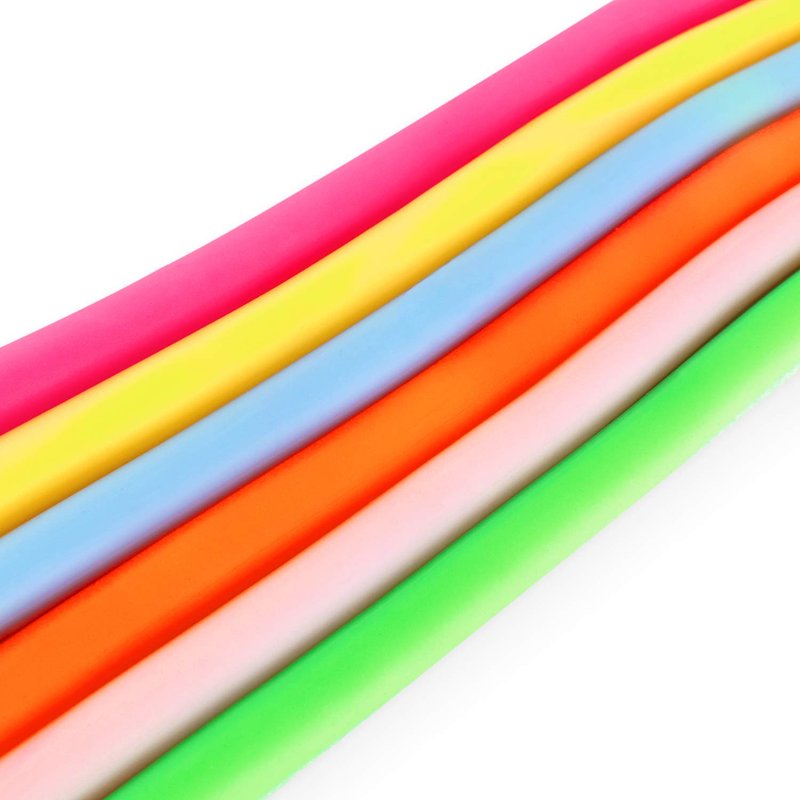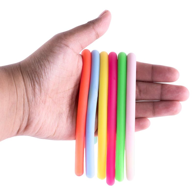 - Each thin jelly string noodle measures 9.5" inches and can stretch to over 5 feet long. Comes in a total of 24 rubber noodle toys, in assorted colors.
