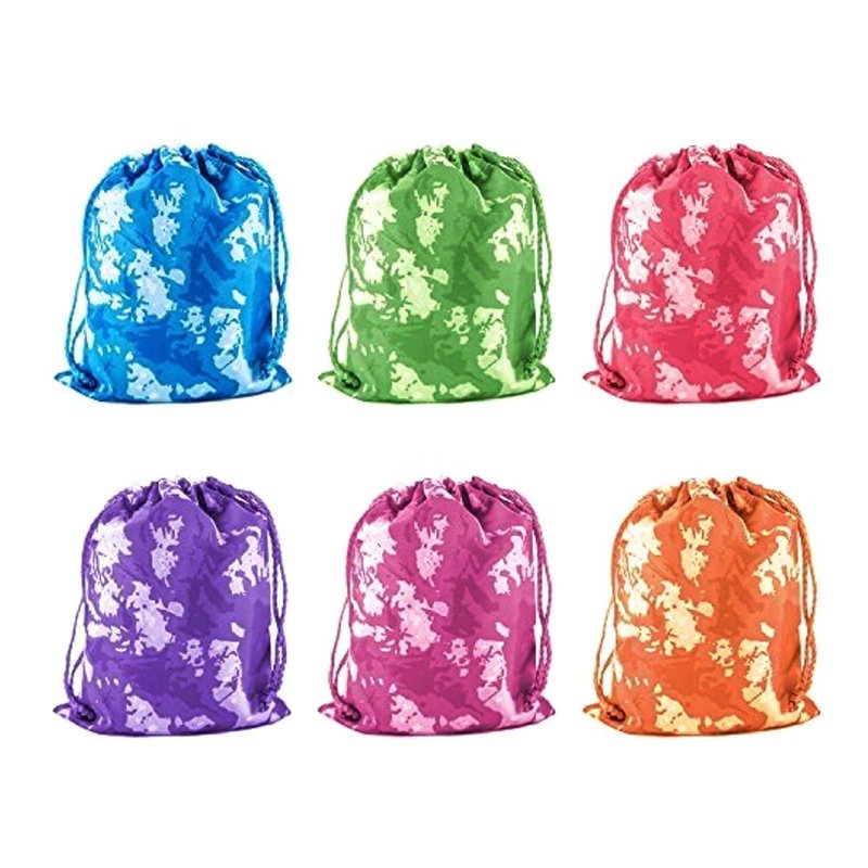 - Comes in a package of 24 tie-dye drawstring bags in camo pattern. Colors include: orange, green, blue, purple, pink, pink/red. With 4 of each color included in every purchase. Make them birthday party favors for a go-to choice for party decorations hawaiian style! These high quality, light weight camo color gift bags are reliable, and great for filling with small keepsakes, candies, small toys or novelty items for birthdays.
