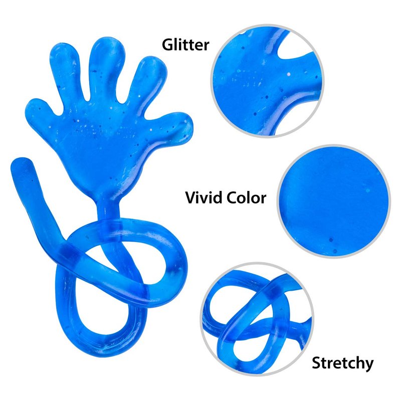 - Each glitter sticky hand measures 1 1/4" wide on a 7" long string. Each package includes 6 dozen (72 pieces) individually wrapped sticky hands. Always have these novelty toys for kids at your next special event.