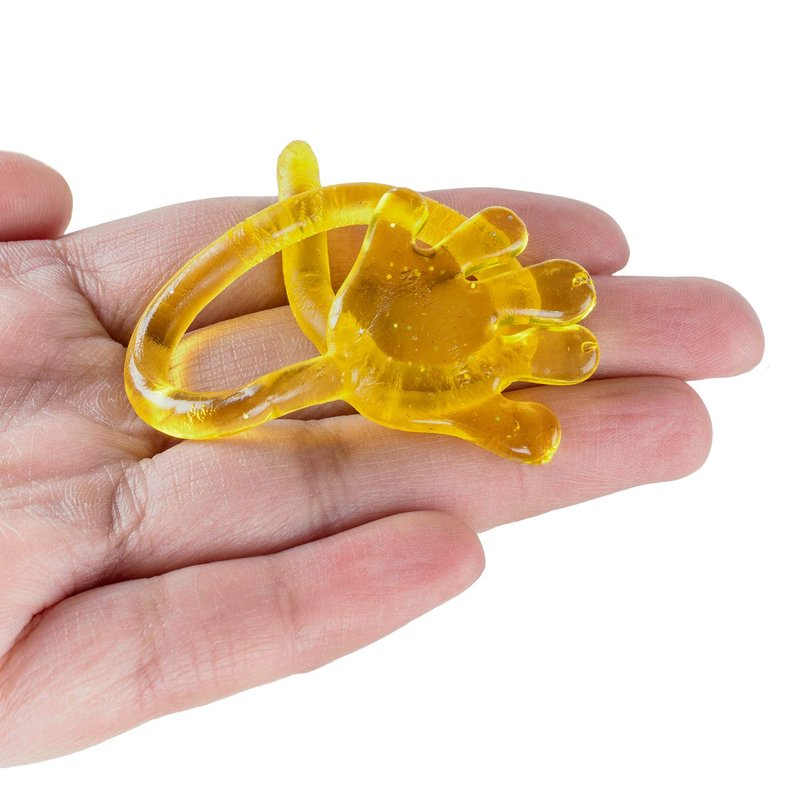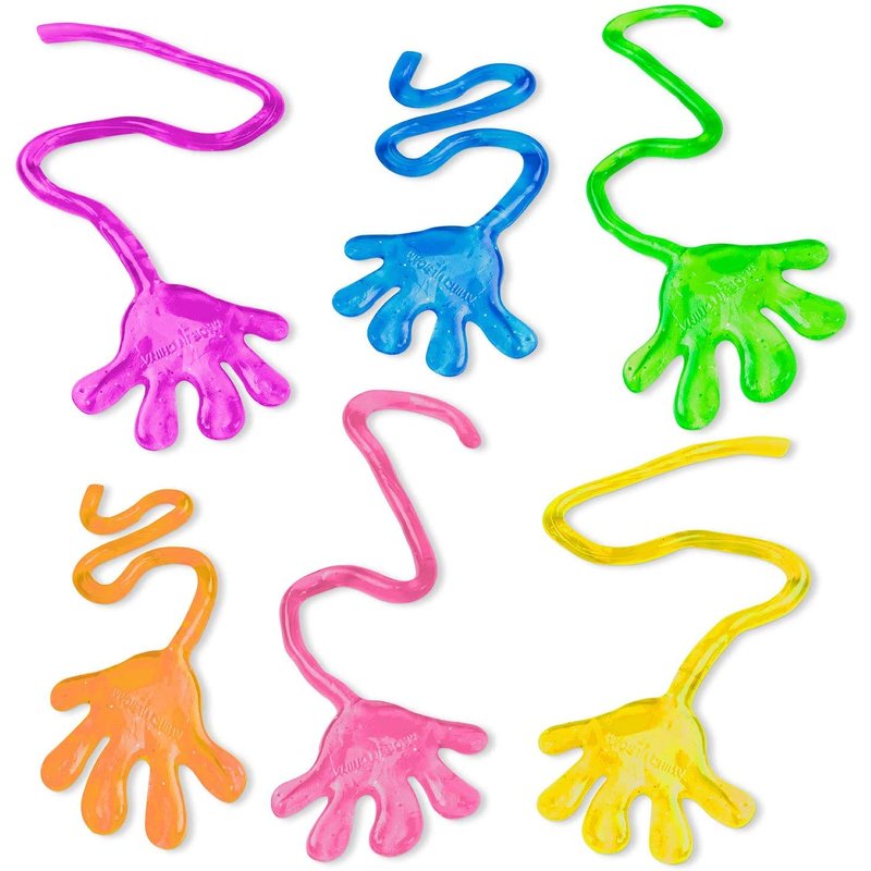 - These bright vinyl mini sticky hands toys are gooey, stretchy, slimy, and tons of fun! Comes in an assortment of vibrant colors such as blue, red, orange, yellow, green, purple, and pink.