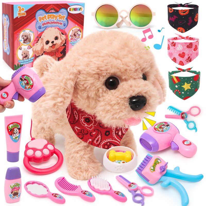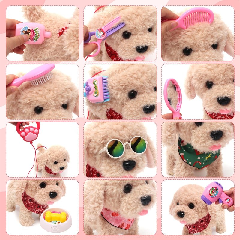 Interactive Walking Plush Toy Dog Realistic Wagging Tail Robot Dog Dress Up Realistic Stuffed Animal Dog Christmas Birthday Gift Toys for Girls and Boys Kids Age 3 4 5 6 Cute Electric Plush Toy Puppy Dog - With lifelike walking, barking, and tail-wagging, your kids can indulge in the joys of pet ownership, the interactive puppy dog feels like a real pet, and the baby can play happily. Comprehensive Grooming Tools - Provide a full grooming experience with shower gel, comb, scissors, and mirror. Kids can engage in pretend bathing and grooming sessions, enhancing their caregiving skills. Children will get a lot of enjoyment in the interaction with the cuddly puppy and accessories toys. Interactive Fun for Hours - Electronic pet toys can also bark, wag their tails, and nod in response when you gently touch their head with your hand or talk to them. Helping achieveing more scene showcase in the playtime thereby cultivate child's love, listening, attention and perception. Safe and Durable - Plush toys use safe and environmentally friendly materials, high-quality realistic fur, comfortable and soft, smooth and tasteless, non-toxic and harmless. Smooth surface design eliminates any worry about rough edges. Perfect Gifts For Girls Boys - For children who love dogs, this will be a wonderful gift for early education, birthday, Christmas, Children's Day. Kids deserve it!
