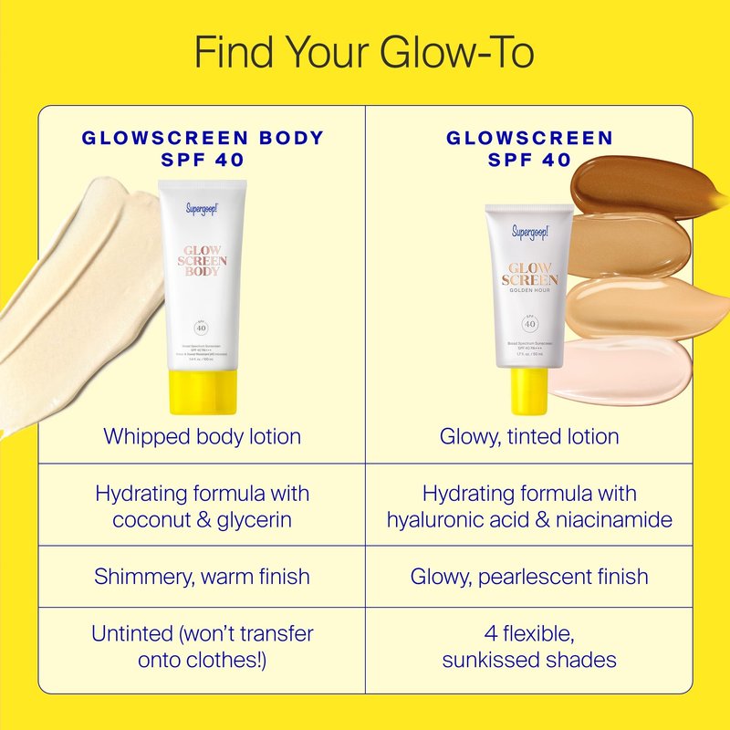 - MULTITASKING SUNSCREEN - Supergoop! Glowscreen Body is a broad spectrum SPF 40 body lotion that delivers warm, subtle shimmer for a natural-looking glow. Think of it as your daily lotion plus glowy highlighter.