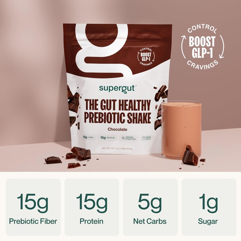 - Gut Goodness in Each Shake: Hit your appetite's off switch with Supergut’s Gut Healthy Prebiotic Shake. Each delicious shake is packed with 15 grams of prebiotic fiber, 15 grams of protein, 5 grams of net carbs, and 1 gram of sugar. It supports a healthy gut while helping you feel nourished and satisfied for longer. Chocolate flavor.