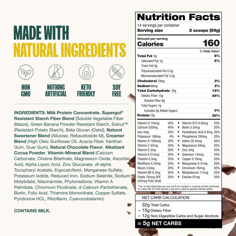 Gut Goodness in Each Shake: Hit your appetite's off switch with Supergut’s Gut Healthy Prebiotic Shake. Each delicious shake is packed with 15 grams of prebiotic fiber, 15 grams of protein, 5 grams of net carbs, and 1 gram of sugar. It supports a healthy gut while helping you feel nourished and satisfied for longer. Chocolate flavor.