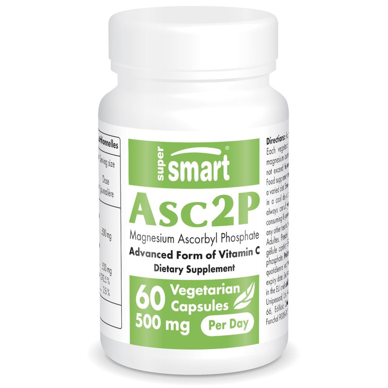 A pioneer in dietary and nutritional supplements for over 30 years. Supersmart Asc2P, magnesium ascorbyl phosphate supplement, is a rare and very stable form of Vitamin C. Vitamin C is recognized for the essential role it plays in many of the body’s functions, as well as for its antioxidant effects. This is an effective form for men and women. It is encapsulated in a vegetable capsule, ensuring a maximized effectiveness of Vit C for all. Our products and formulas are constantly updated to reflect the latest scientific research, advances, and production methods. We offer an outstanding quality and choice of Gluten Free, Non-GMO, Additive Free, Soy Free, Nano Particules Free and Vegan Friendly products. Supersmart offers top and pharmaceutical quality products since 1992 in form of softgels, powder, capsules, tablets, and enteric coated pills. More than 400 Supersmart products are made in GMP (Good Manufacturing Practices) & HACCP (Hazard Analysis & Critical Control Points) certified facilities. Our facilities are located in the EU and in the USA for products from all around the world. Our guiding principles have remained the same for the past 30 years, we prioritize quality, safety, efficacy, and scientific validation.