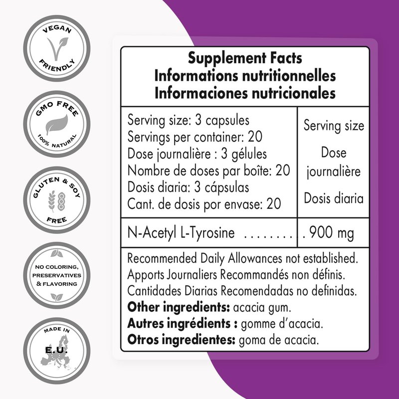 - Recommended Use - Take 1 to 3 capsules a day. Each vegetarian capsule contains 300 mg pharmaceutical grade N-acetyl L-tyrosine | Contains N-acetyl L-tyrosine NALT | Other ingredient: acacia gum.