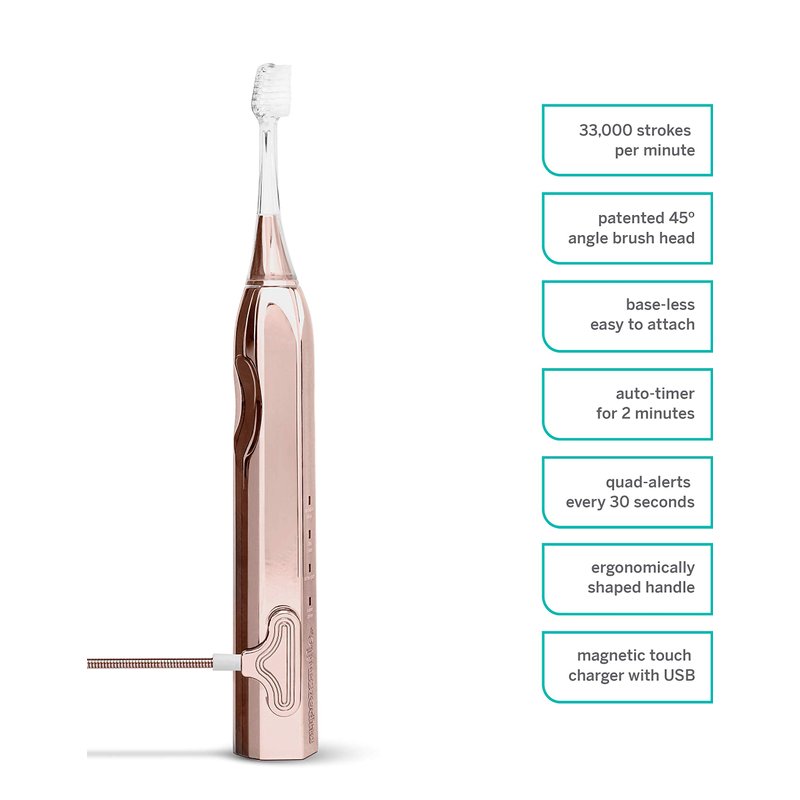 - Patented 45° Angled Brush Head - Designed to reach below the gum line and effectively clean where plaque accumulates. The design features five tufted rows of DuPont soft, nylon bristles, ensuring pro-level cleaning and gum health while efficiently polishing the tooth surface.