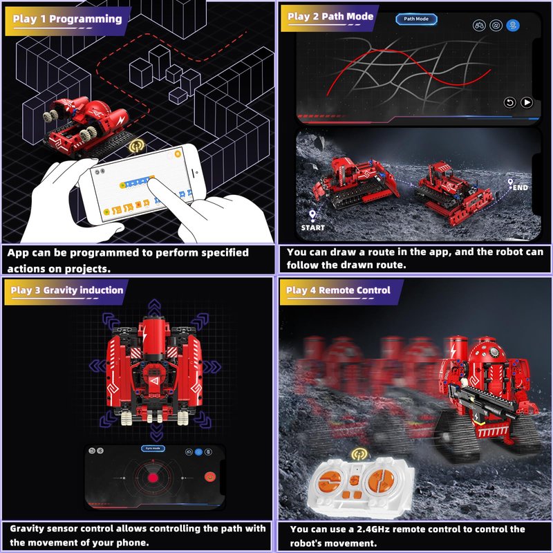 - APP and Remote Control: This robot can be controlled not only by a remote control but also by an app via Bluetooth programming. It also features a gyroscope and path control, enabling precise control of the robot's movements and helping children learn programming and control skills.