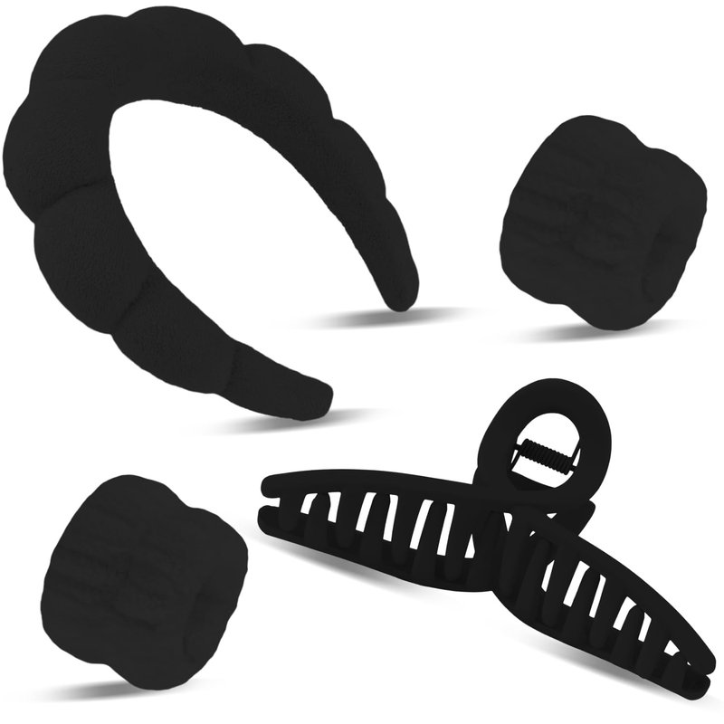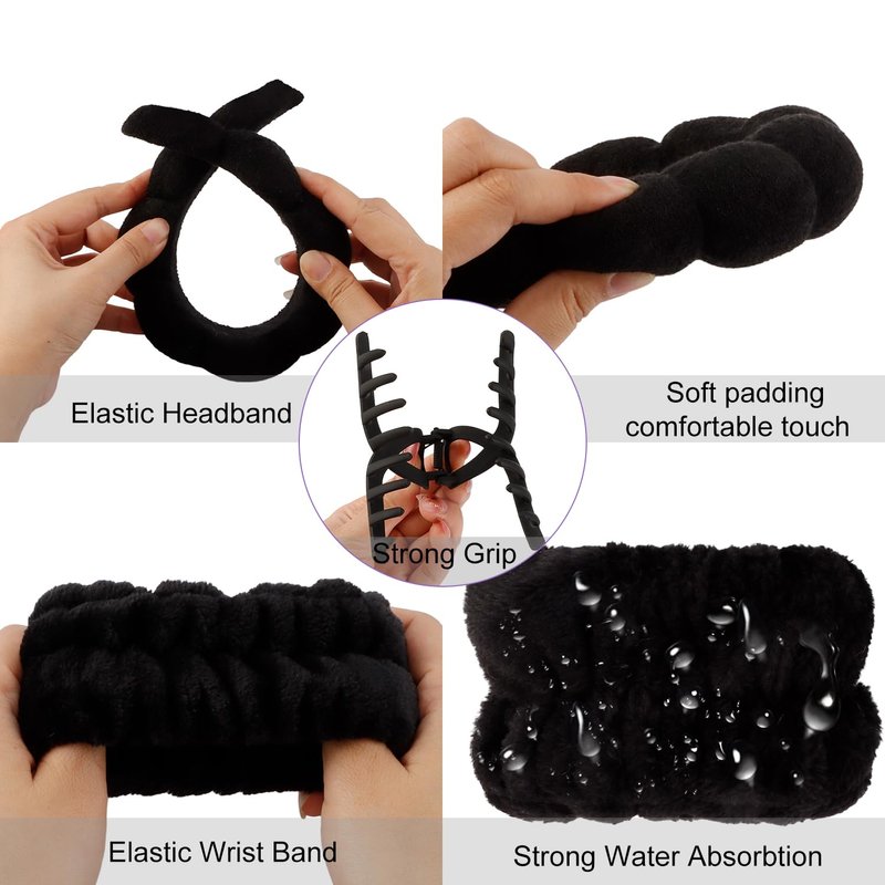 SuPoo 4pcs Face Wash Headband and Wristband Set Black Sponge Makeup Headband Puffy Skincare Headband Terry Cloth Spa Headband Cute Wrist Towels Hair Band for Washing Face Accessory with Claw Clips