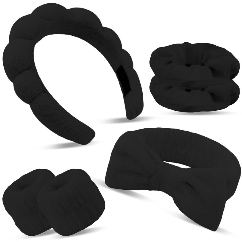 SuPoo 6pcs Black Spa Headband Sponge Face Wash Headband and Wristband Set Makeup Head Band Puffy Skincare Terry Cloth Wrist Towels Hair Band for Washing Face Padded Headwear with Hair Ties