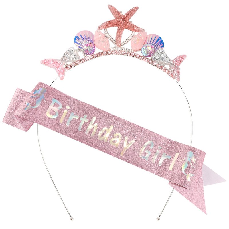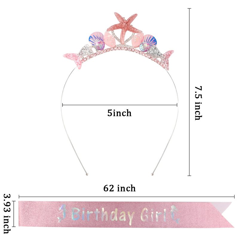 SuPoo Mermaid Birthday Crown and Sash Mermaid Birthday Decorations Mermaid Tail Birthday Headband Princess Tiara Seashell Birthday Girl Crown Little Mermaid Party Decorations Outfits Hair Accessories