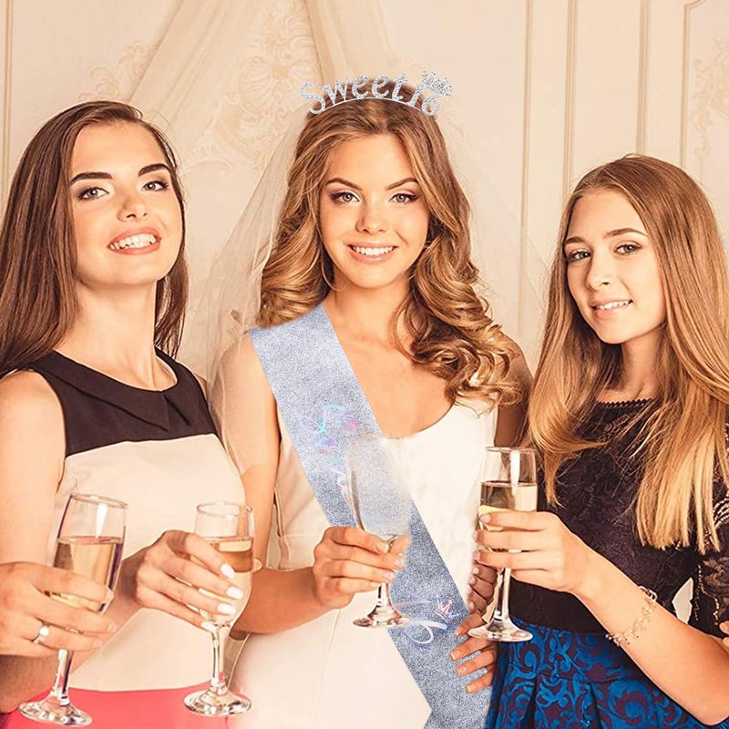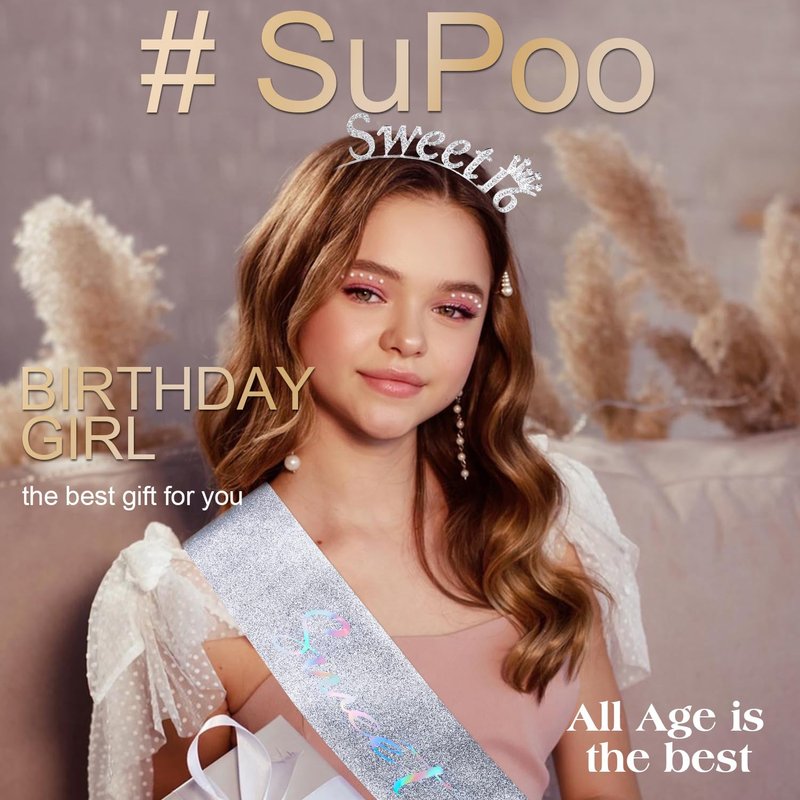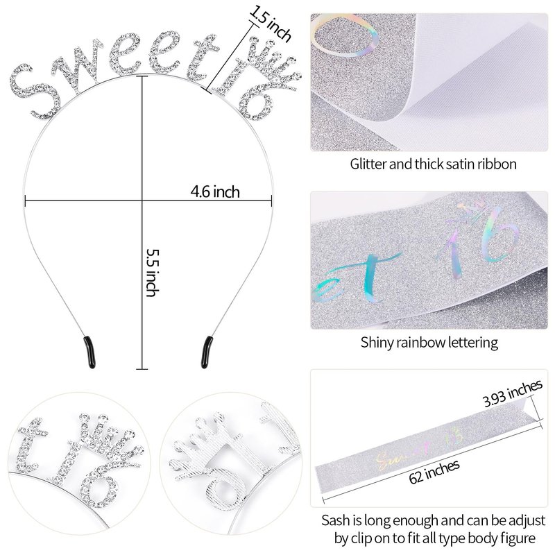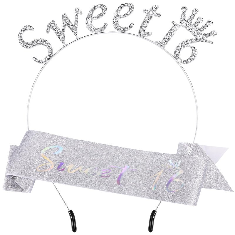 SuPoo Silver 16th Birthday Crown and Sash Sweet 16 Tiara Headband 16th Birthday Decorations for Girls Sweet 16 Sash Happy Sixteen Party Decorations Party Favors Birthday Girl Headband