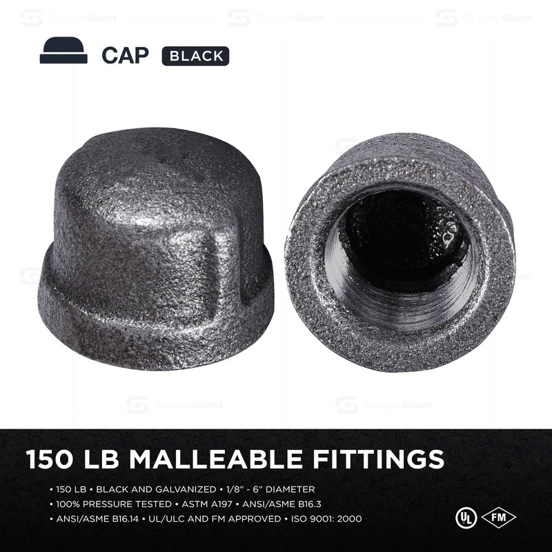 - Iron cap: 1/2" Black malleable iron cap female npt threads