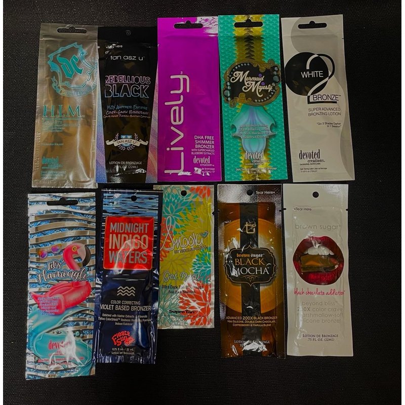 10 Assorted tanning bed packets no tingle This 10 pack will possibly include Devoted Creations, Ed Hardy, Supre, Snooki, Hempz, ProTan, Fiesta Sun,Tan Asz U
