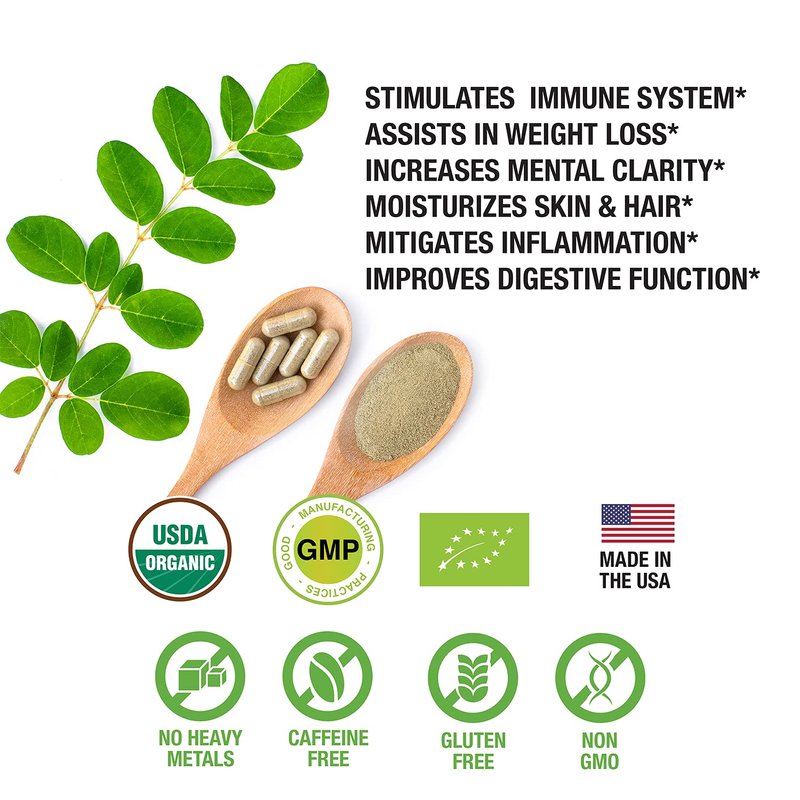 - OUR 100% RAW AND PURE MORINGA POWDER CAPSULES ARE CERTIFIED ORGANIC: Caffeine-free, Gluten-free, Non-GMO, No Heavy Metals, and USDA Organic Certified.
