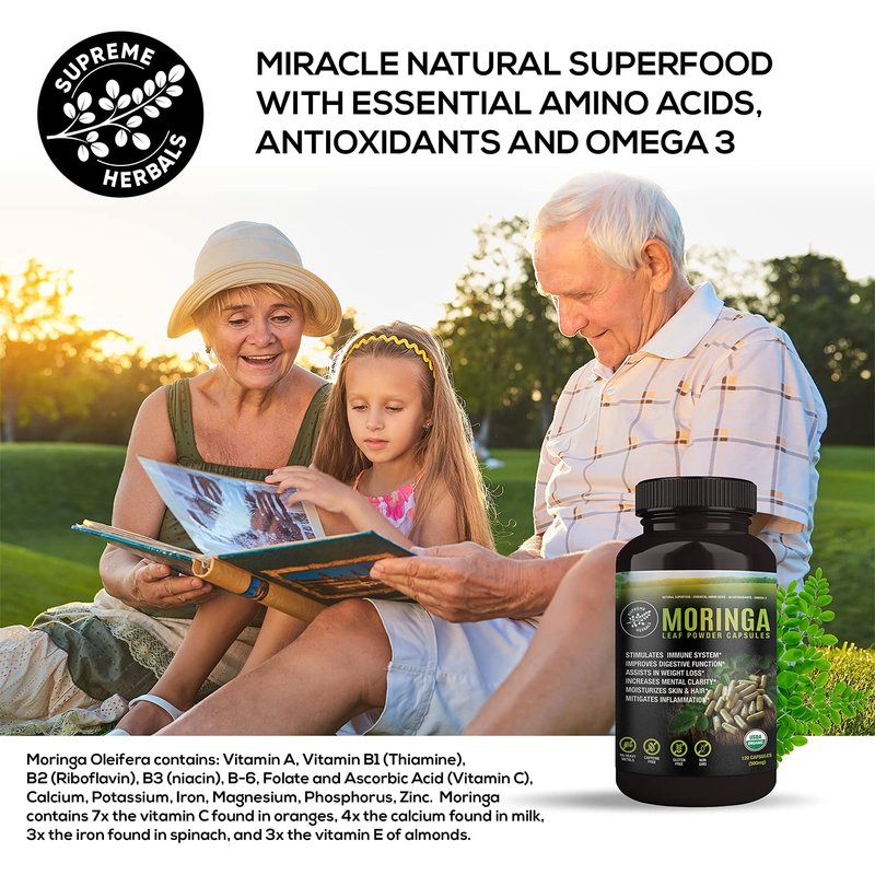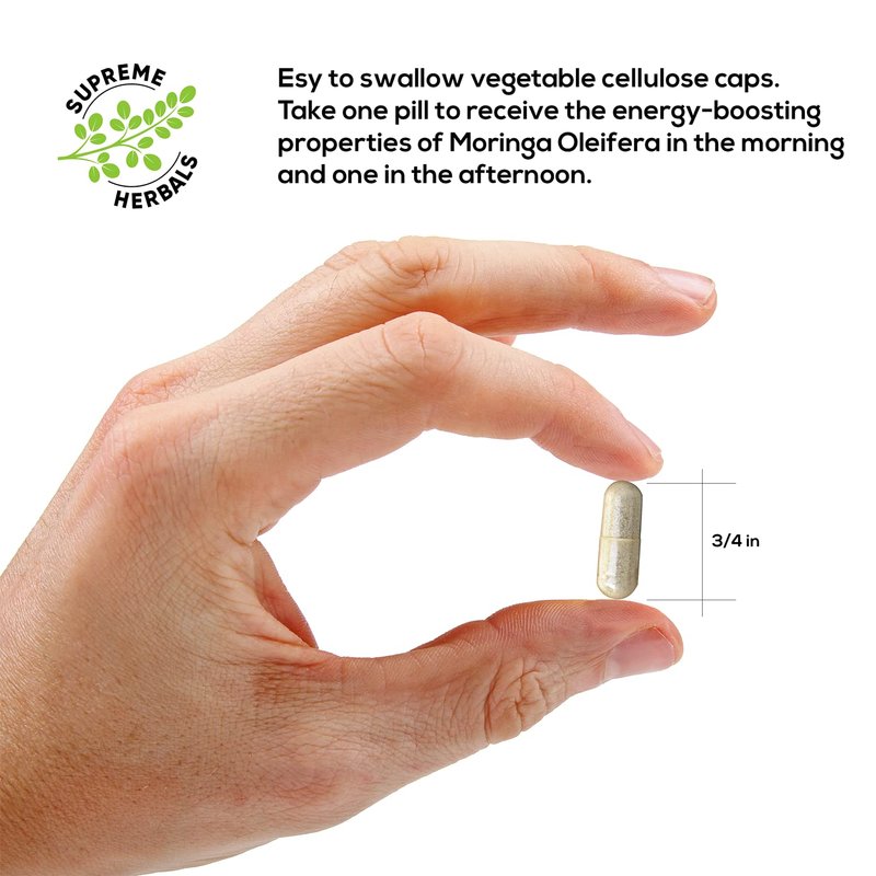 Supreme Herbals Moringa Oleifera Powder Capsules are 100% raw Moringa leaves with no additives or fillers. Feel the true hand of nature working to help you achieve a better you. Moringa Oleifera has been praised for its health benefits for thousands of years. It is rich in vitamins, antioxidants, phytonutrients, and all essential amino acids that are key to better health and wellbeing. Organic Moringa Leaf Powder Capsules are made from whole moringa tree leaves, grown in the rich mineral volcanic soils of Central America and irrigated with pristine waters. Moringa is one of nature's most nutritious foods, and it is rich in antioxidant carotenoids such as beta-carotene and provitamin A. Safety Information PROTECT FROM HEAT, LIGHT, AND MOISTURE If you are pregnant, nursing taking medication, or planning a medical procedure, consult a physician before using. Keep out of reach of children. Ingredients 100% Raw Moringa powder. The veggie capsule is made from vegetable cellulose. Directions Take 2 capsules twice a day (morning and afternoon) Legal Disclaimer Statements regarding dietary supplements have not been evaluated by the FDA and are not intended to diagnose, treat, cure, or prevent any disease or health condition.
