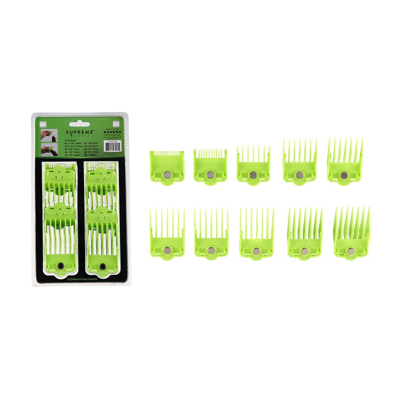 10 Different Size Magnetic guards that are Patented By Supreme Trimmer. Trim any length of hair securely on your Head, Face or Body. Size: 1/16”, 1/8”, 3/16”, ¼”, 3/8”, ½”, 5/8”, ¾”, 7/8”, and 1”. Purchase Separately a Variation of Colors by Searching “CMG100” . We do Not Recommended using other brand guards on Supreme Trimmer products as it may damage your guide combs.