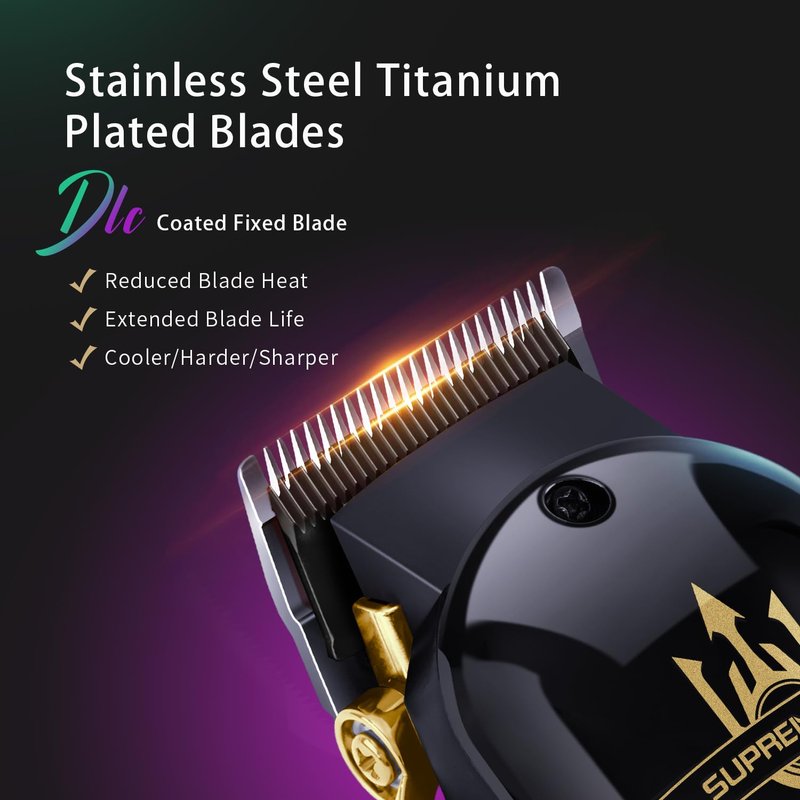 - 【Titanium Alloy + Zero-gapped】 Our professional hair clippers use a combination of titanium alloy moving blades and DLC-coated fixed blades ,easily to zero-gapped , can supports three different types of replacement knives to achieve high/medium/low gradients. This combination provides excellent wear resistance, effectively resisting scratches and wear. It improves the durability and service life of the hair clipper blades, allowing you to use them for years while still keeping them sharp. It also reduces friction and wear, keeping the blades cool and protecting your skin from burns.