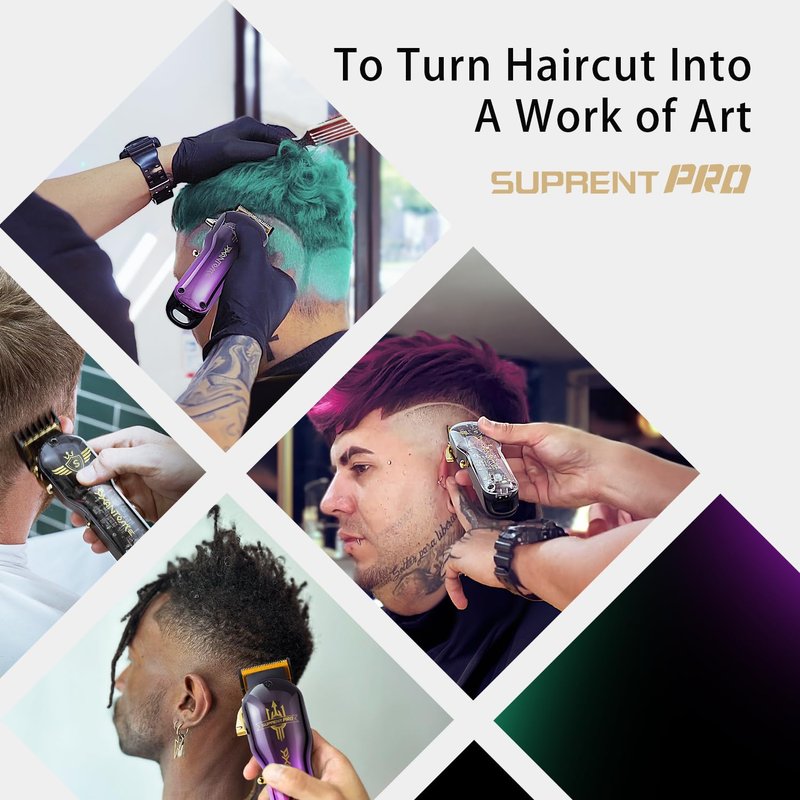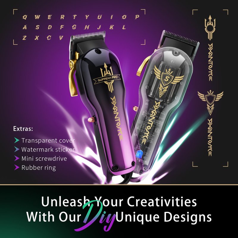 - 【DIY Customizable Shell】 SUPRENT barber clipper's DIY customization design is the perfect choice for DIY enthusiasts! It allows you to create a unique shell that meets your preferences. It is encased in a robust all-metal body and reinforced with an aluminum shell, making it durable and resistant to accidental drops. This hair clipper kit comes with a stylish gradient purple shell, as well as a transparent shell and watermark stickers for you to freely express your creativity. With the small screwdriver we provide, you can easily change the shell. Hairdressing is an art, and your hair clipper can also be a work of art.