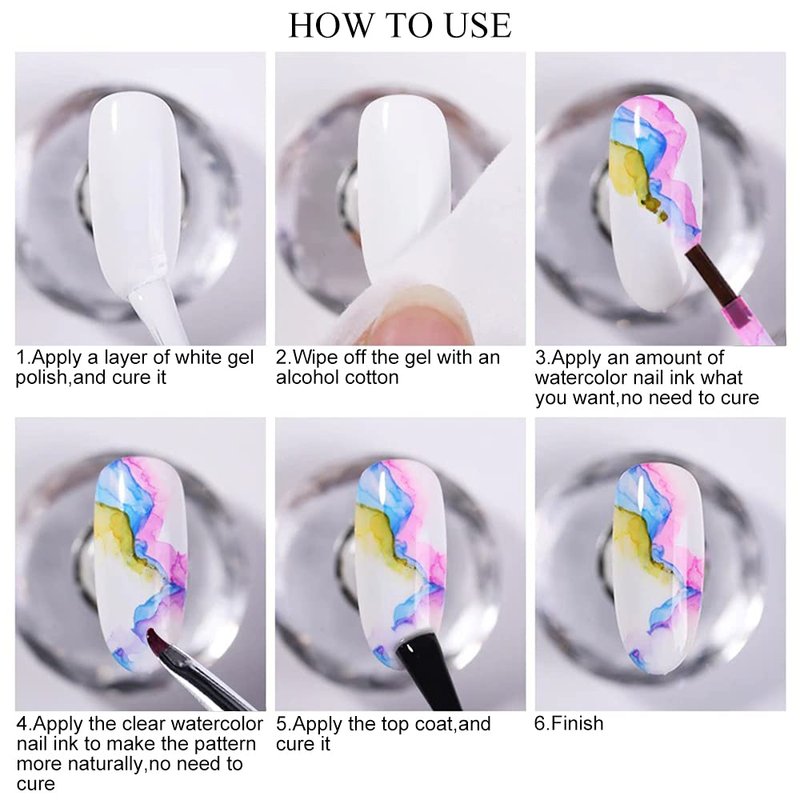 - Warm Tips: This clear watercolor ink is used to assist the nail blooming, will make the watercolor effect more naturally, After Using the clear watercolor ink, wash the brush cleaner to prevent mixing other colors