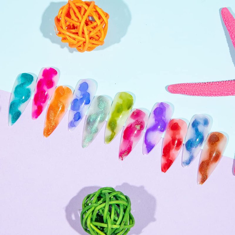 - What You Get: This Watercolor Ink Nail Polish has 12 colors marble nail polish which contains a clear blooming nail polish, combinate with shimmer glitter, it's a popular choice create eye-catching and trendy nail designs