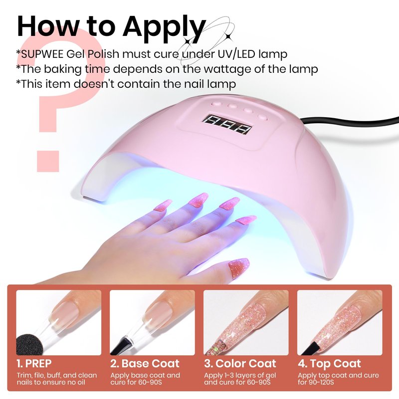- 【Important Tips】If you want to achieve the reflective effect, must be in strong light and turn on the flash when taking the photo. SUPWEE Gel Polish required UV/LED lamp. Due to the lighting and screen setting, color may vary slightly from the picture