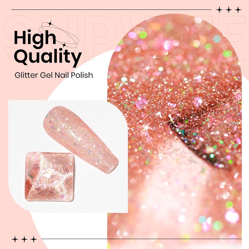 SUPWEE Glitter Gel Polish Sparkly Holographic Nail Polish Gel Rose Gold Reflective Gel Polish 15ml Soak Off UV Lamp Gel for Home DIY Manicure