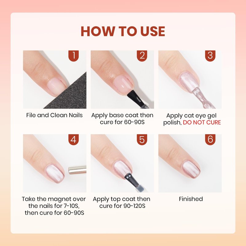 - 👀Please Note: 1. Please skin test before using to avoid allergic. 2. Base gel and top coat are necessary. 3. Ensure each layer is properly cured. 4. Please hold the magnet over nails for 7-10S to get stunning cat eye effects. 5. We recommend that you learn more techniques online to achieve better effects.