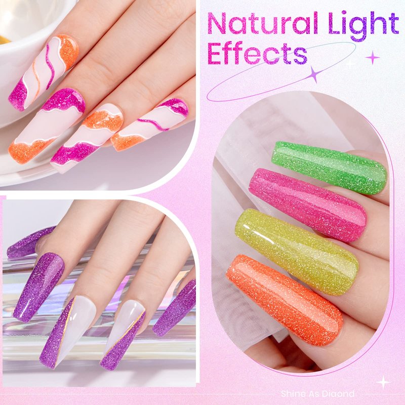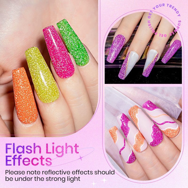 SUPWEE Neon Reflective Glitter Gel Nail Polish Sparkle Fluorescent Nail Polish Gel Shiny Disco Nail Gel Polish Neon Yellow Green Hot Pink Orange Gel Polish Set Soak Off UV Gel