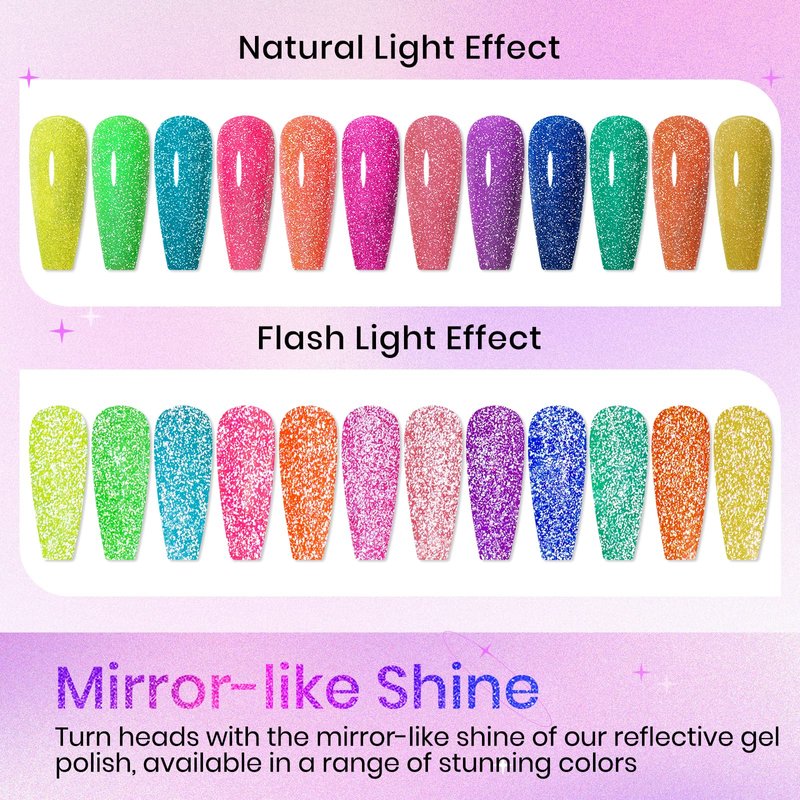 - 💛【What You Get】12 different colors Fluorescent Reflective Gel Polish with gifts box, 7ML(0.24fl oz) each bottle.