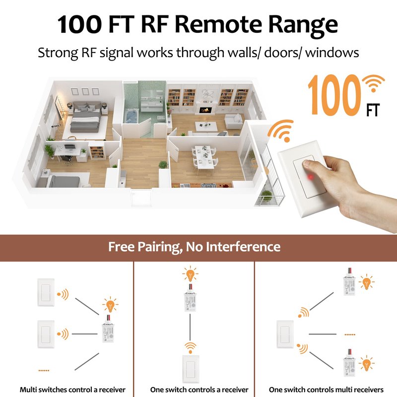 Up to 100 FT in the open area, 433.92MHz strong RF signal works through walls and doors. It does not require a line of sight between the wireless switch and receiver and allow you to use the switch in any room to remote control the pairing lights or devices.
