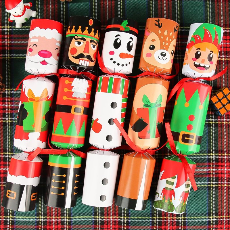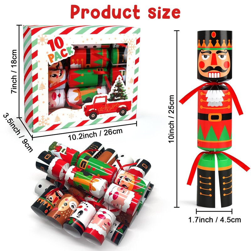 - [ Christmas Super Value ] Christmas party table favors set includes 10 packs of no-snaps party favors. Each party favor contains a party paper hat, a Christmas joke paper and a random gift inside