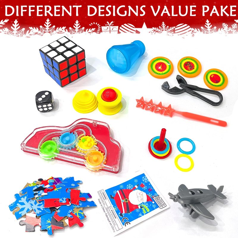- [ Unique design ] Gifts include metal airplane model, dice, cube, spinning top, puzzle, flashlight, car model and so on. Perfect additional decoration to your home this Christmas season. This would add charm and Christmas holiday ambiance to anywhere you put it. Also works as a great present for your friends and family