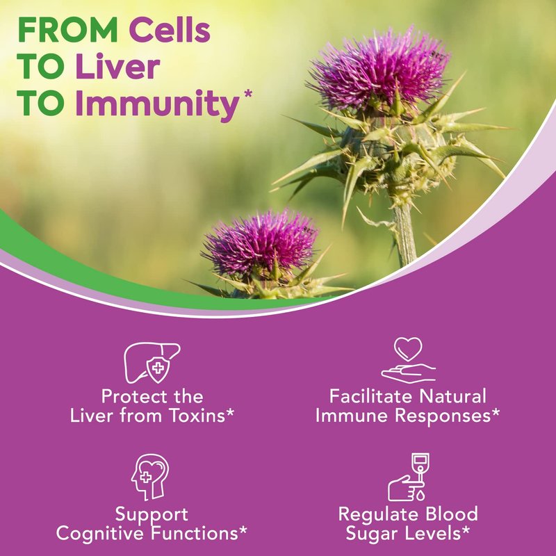 - Liver Detoxification & Antioxidant Support*: Milk thistle, especially silymarin, possesses powerful liver-cleansing & antioxidant properties to directly support liver function and boost the liver’s glutathione production (the body’s major antioxidant).* Our once-daily milk thistle capsule helps regenerate and maintain high levels of glutathione to remove toxins that build up in your body, support the creation of new liver cells, neutralize free radicals, and facilitate natural immune responses.*
