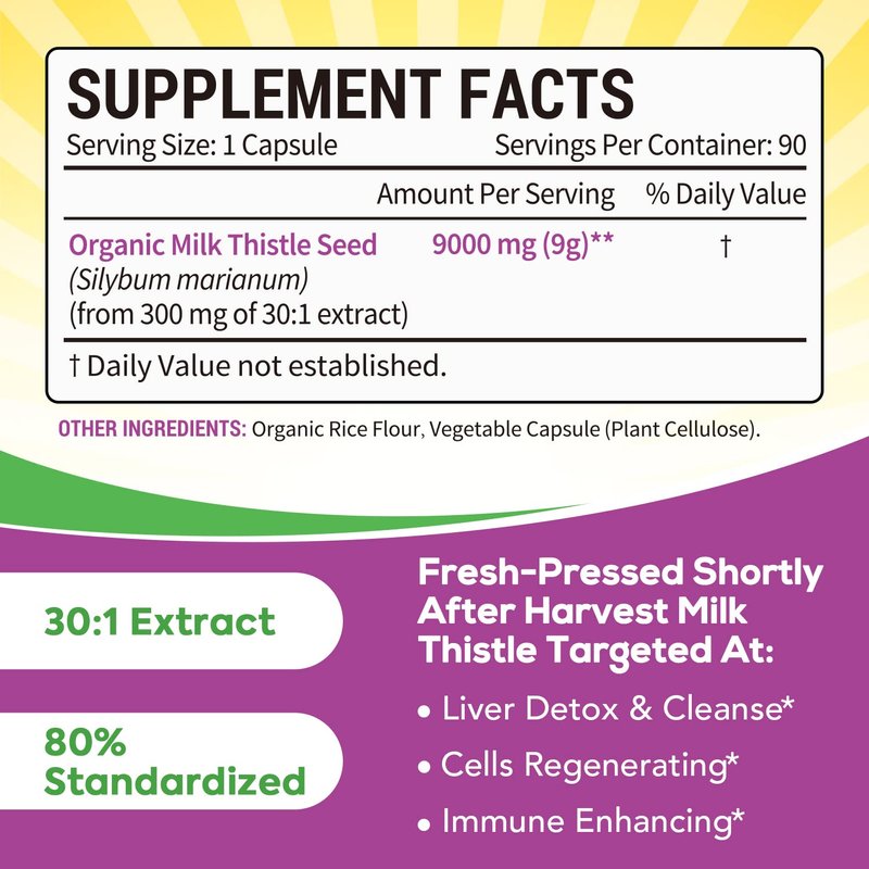 - 30X Concentration & 80% Silymarin: Surebounty Organic Milk Thistle features 9000 mg of raw milk thistle seed from 300 mg of 30:1 extract. The seeds are super concentrated into extracts for improved bioavailability and optimal absorption.* This 30X extract is standardized to 80% (240 mg) silymarin flavonoid, the most active compound of milk thistle, to ensure maximum efficacy.*