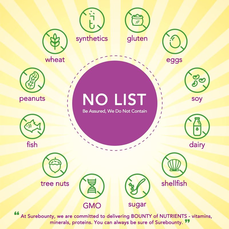 - No Allergens or Nasties: Surebounty has always been dedicated to formulating supplements that cater to people from all walks of life and can easily fit into their daily routines. We want you to enjoy the amazing benefits brought by our products without worrying about getting allergic. Be Assured: NO GMOs, soy, gluten, milk, sugar, egg, wheat, corn, nut, fish, shellfish. And never will you find Nasties like artificial ingredients, fillers, binders, or preservatives in Surebounty!