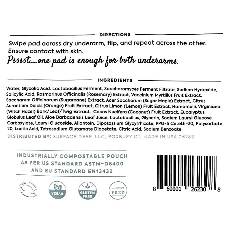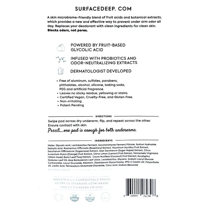 - BIODEGRADABLE: Surface Deep takes eco-consciousness to the next level by offering biodegradable packaging, making it easy for customers to make a sustainable choice while enjoying the benefits of their innovative deodorant pads.