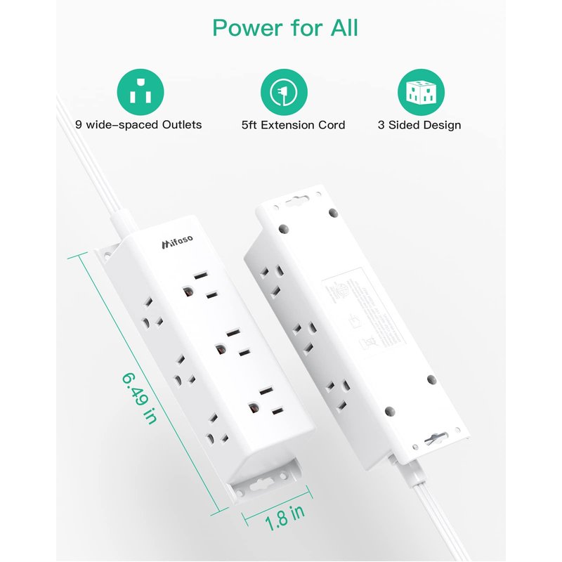 - 【3 Side Design & Wide Spaced Outlets】- 9 AC outlets with long space in between, fit all kinds of plugs and without blocking each other. Takes up less space on your desk or wall due to this compact 3-sided design, suitable for the home, office, and dorm room.