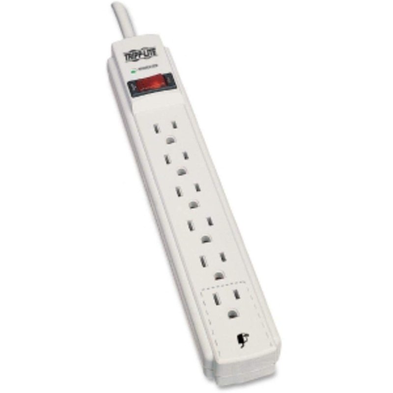 The Excellent Quality Surge Protector Strip 6 Outlet - Tripp Lite's TLP615 offers economical AC surge suppression for protection of workstations, desktop PCs, telecom systems and other sensitive electronics. Built-in AC surge suppression shields connected equipment from damage and performance problems due to transient surges. TLP615 offers 6 total outlets, 15 foot cord and diagnostic LED to warn of suppressor damage. AC suppression rated at 790 joules shields equipment from surges and line noise. Attractive gray suppressor housing with keyhole mounting tabs offer convenient protection of desktop computer equipment and accessories. $20,000 Ultimate Lifetime Insurance (USA & Canada Only). Key Features 6 outlets 15-ft. cord Surge suppression rating: 790 joules EMI/RFI noise filtering 15 amp resettable circuit breaker Green protection LED Includes full normal mode (H-N) and common mode (N-G/H-G) line surge suppression Can accommodate 1 large transformer plug without covering remaining outlets, 3 total transformers Keyhole support for wall mounting Lighted power switch $20,000 Ultimate Lifetime Insurance (USA & Canada only) Lifetime product warranty Typical Applications Ideal for any desktop, network or home computing application requiring AC line protection Package Includes TLP615 surge suppressor Instruction manual with warranty information