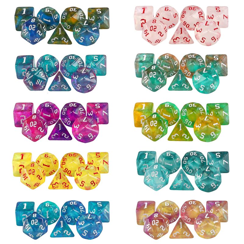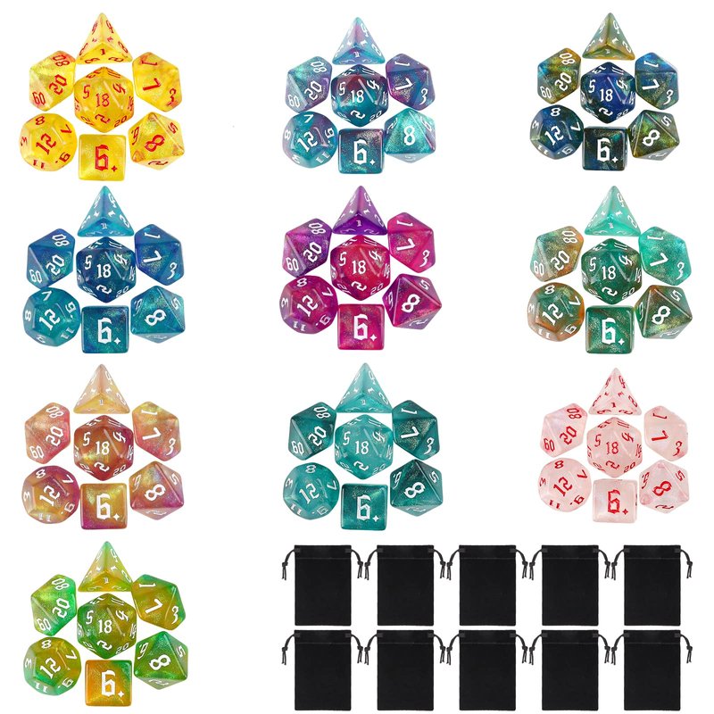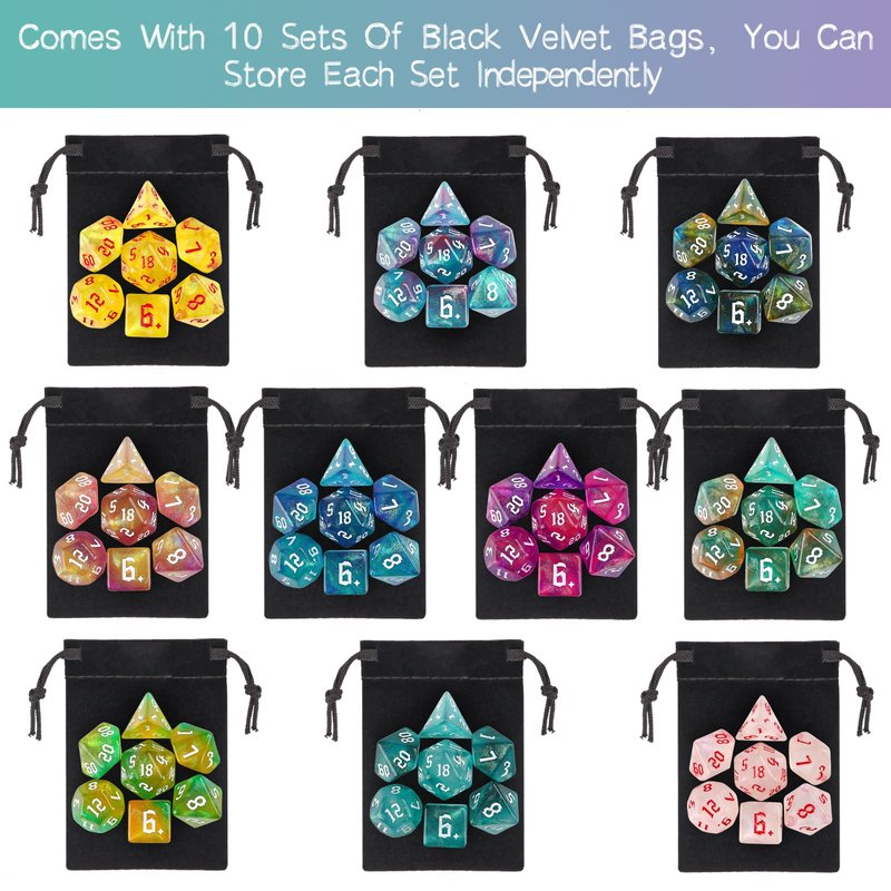 - You will receive a 10 x 7 dice set (70pcs), 10 drawstring bag.