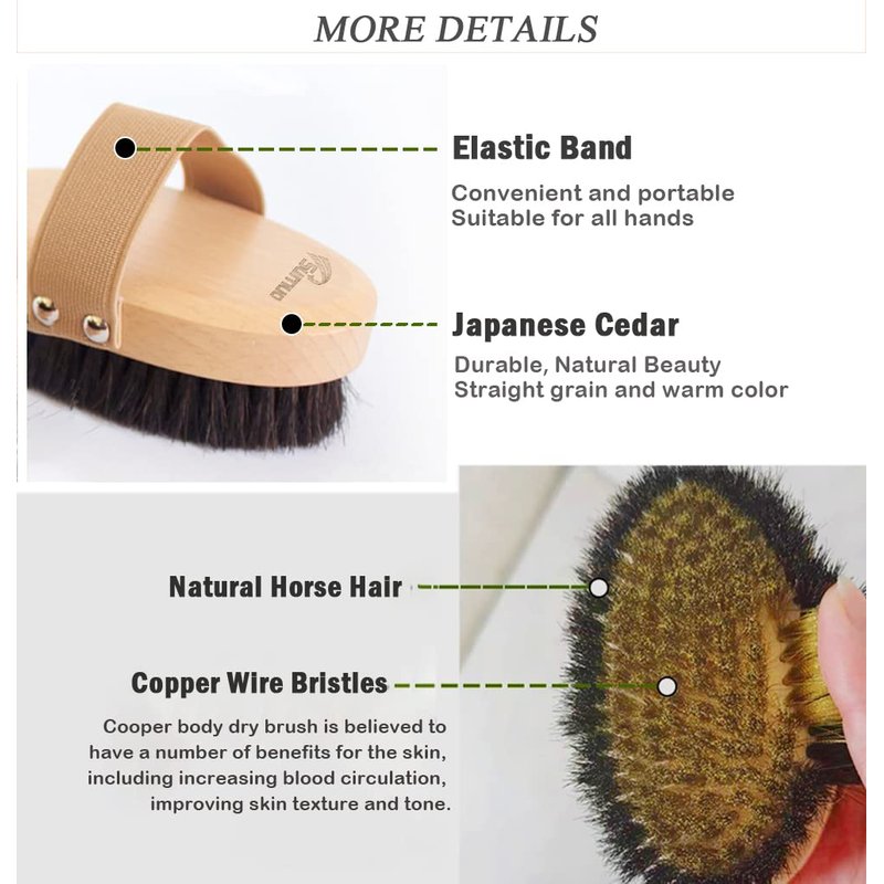 - 【Functions】Dry body brushing involves using a brush with copper ion to gently exfoliate the skin and improve circulation. The bristles of a dry body brush can help to reduce stress and promote relaxation.