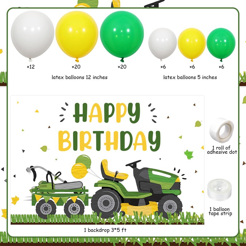 - Lawnmower Birthday Decorations: Package includes 1pc backdrop 5*3ft, 52pcs latex balloons 12”, 18pcs latex balloons 5”, 1pc balloon tape strip, 1 roll of adhesive dots, 2pcs ribbons.