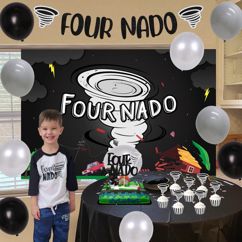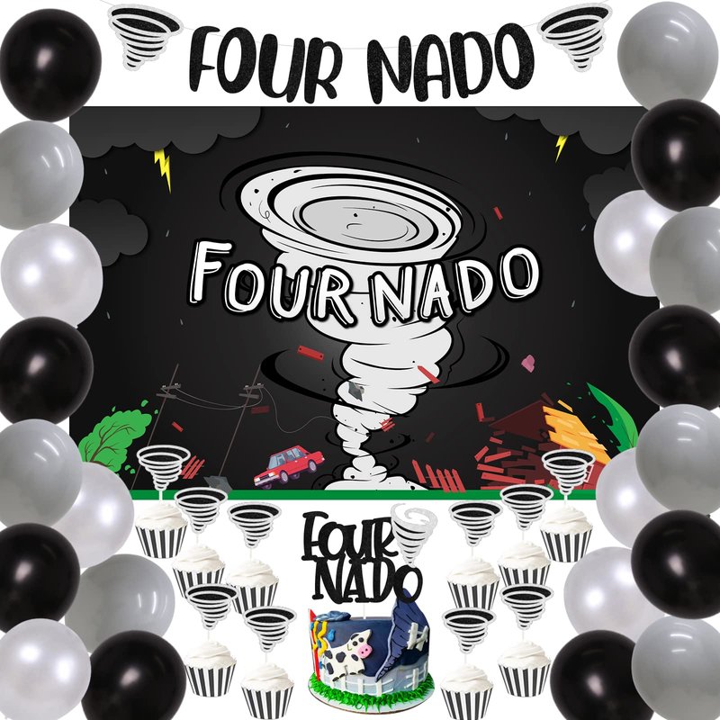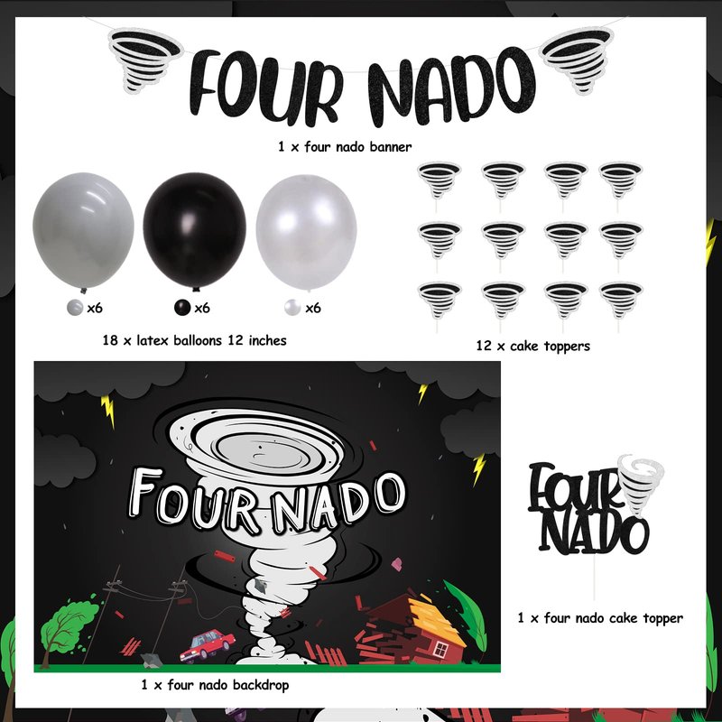 - Tornado Birthday Decorations: Include FOUR NADO banner, FOUR NADO backdrop 5 x 3 ft, FOUR NADO cake topper, 12pcs tornado cupcake toppers and 18pcs latex balloons 12”.